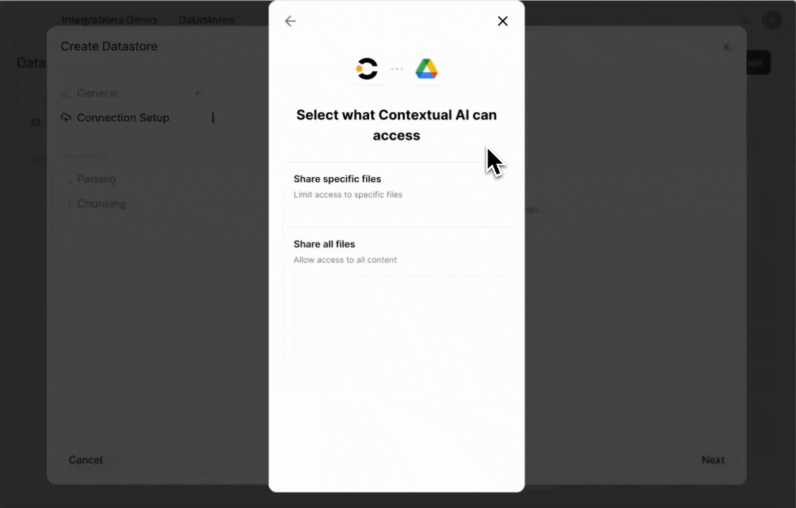 Ingesting data from third-party sources just got easier. You can now sync data directly from external systems such as Google Drive and Microsoft SharePoint. With just a few clicks, you can connect, authenticate, and select the folders to ingest into a datastore that respects existing permissions.